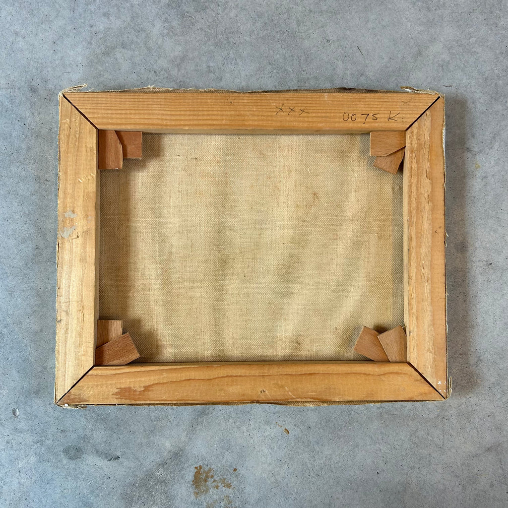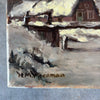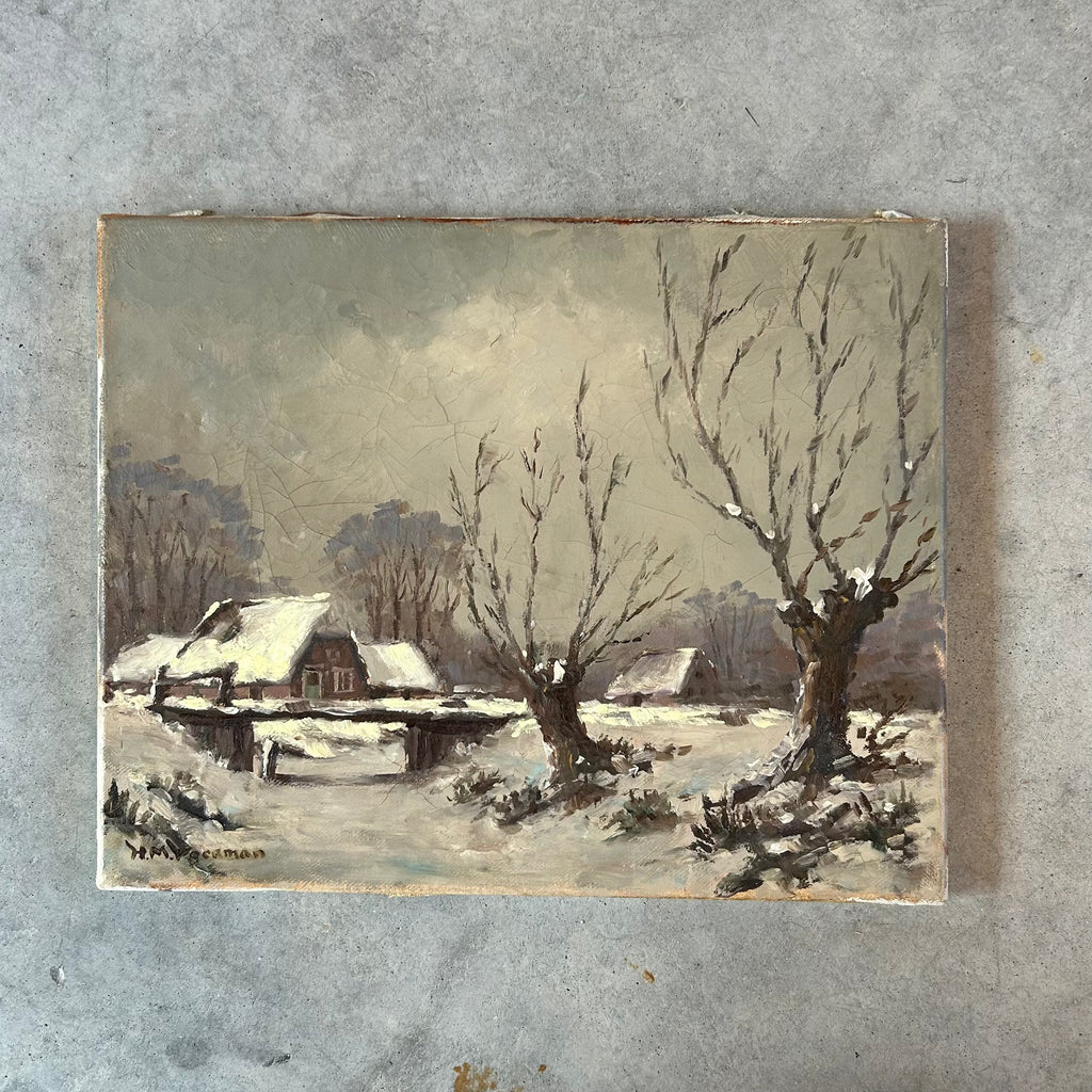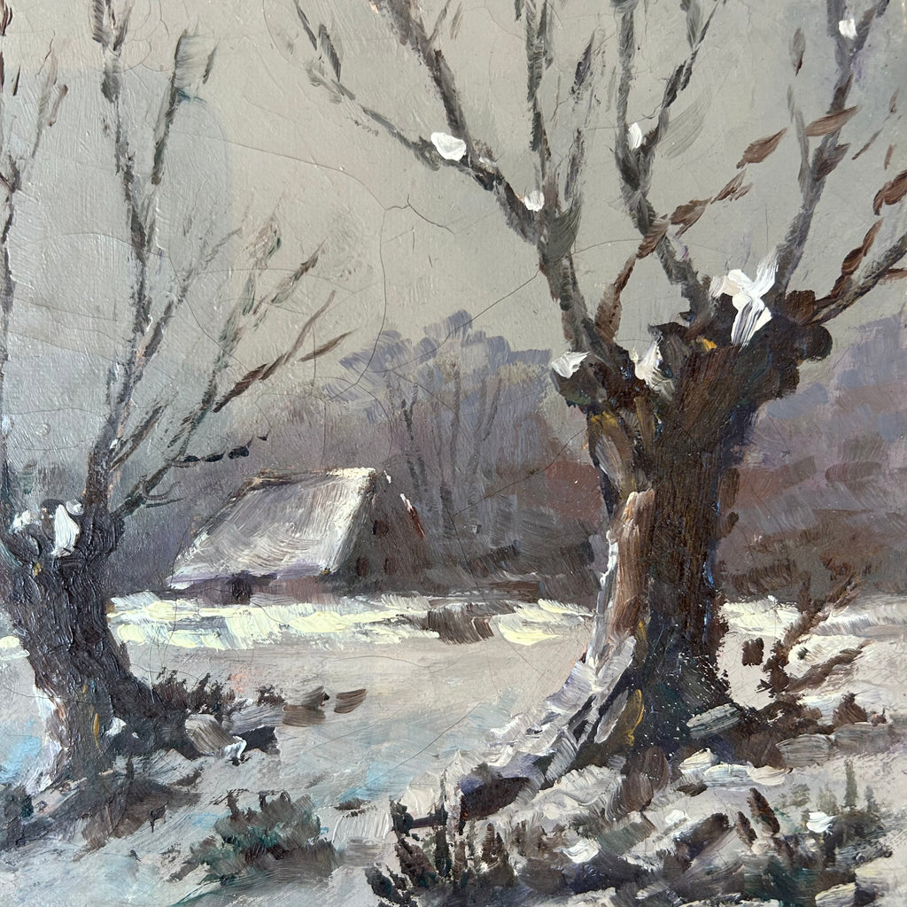 A beautiful vintage oil painting of a winter landscape in wonderful moody grey tones. Signed.